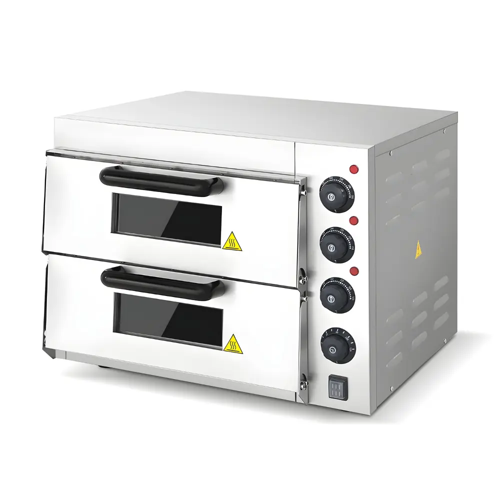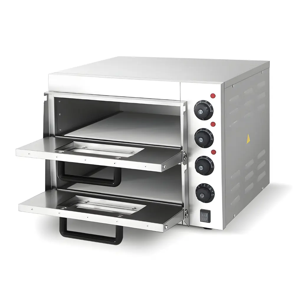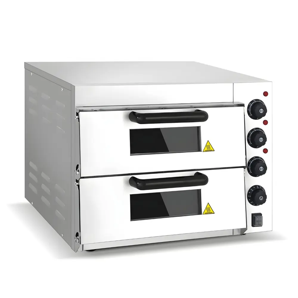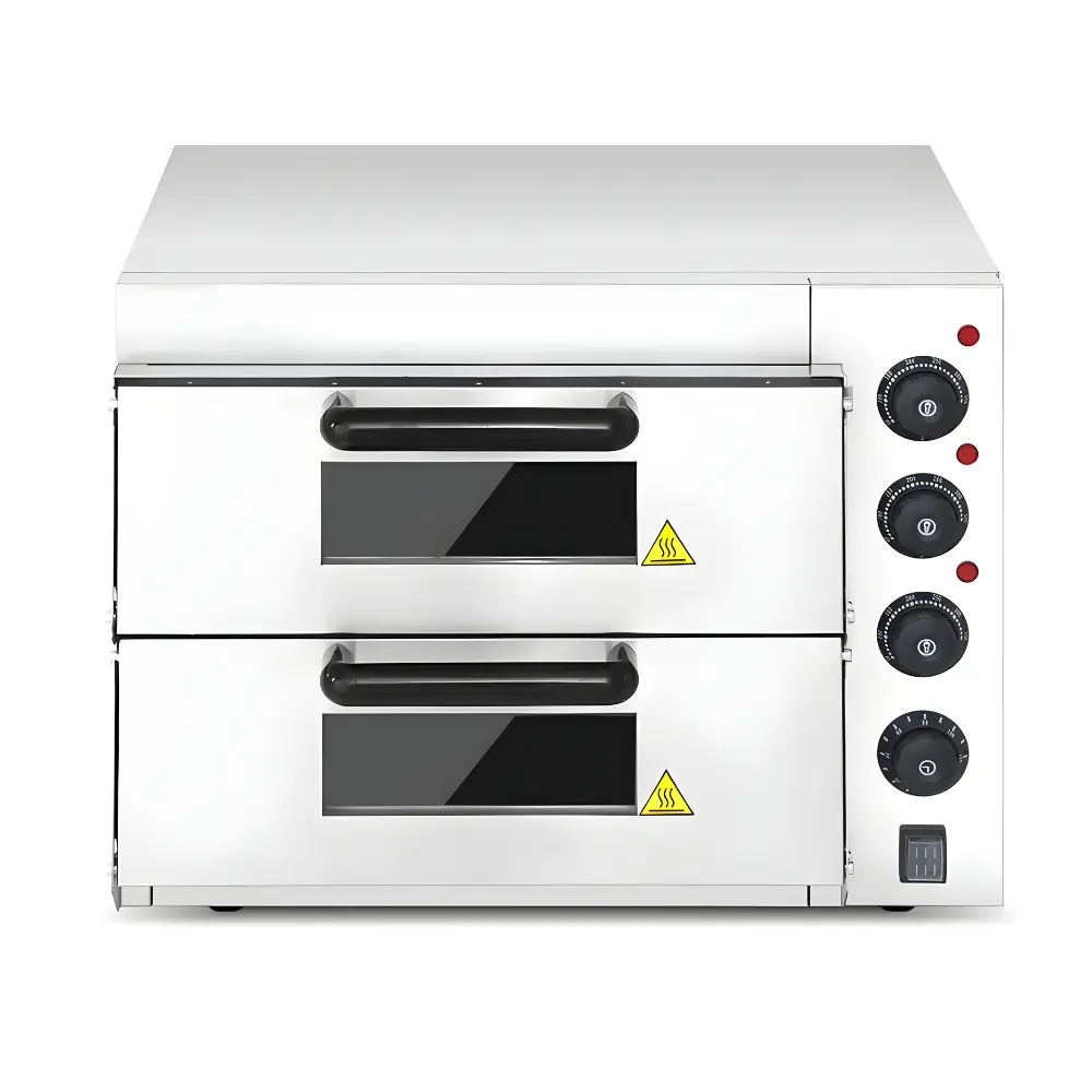 Επαγγελματικός φούρνος πίτσας με σύστημα θέρμανσης σε σχήμα U για περισσότερη θέρμανση. Όλο το μηχάνημα είναι κατασκευασμένο εξ' ολοκλήρου από ανοξείδωτο ατσάλι 201. Το εύρος θερμοκρασίας είναι 0-350℃ και το πάχος του σκληρού γυαλιού είναι 5mm. Κάθε στρώση περιέχει πέτρινες πλάκες, το πάχος των πέτρινων πλακών είναι 10mm±0,5mm. Χρονοδιακόπτης 0-120 λεπτά. Αντιολισθητικά πόδια από καουτσούκ για αποφυγή ολίσθησης.