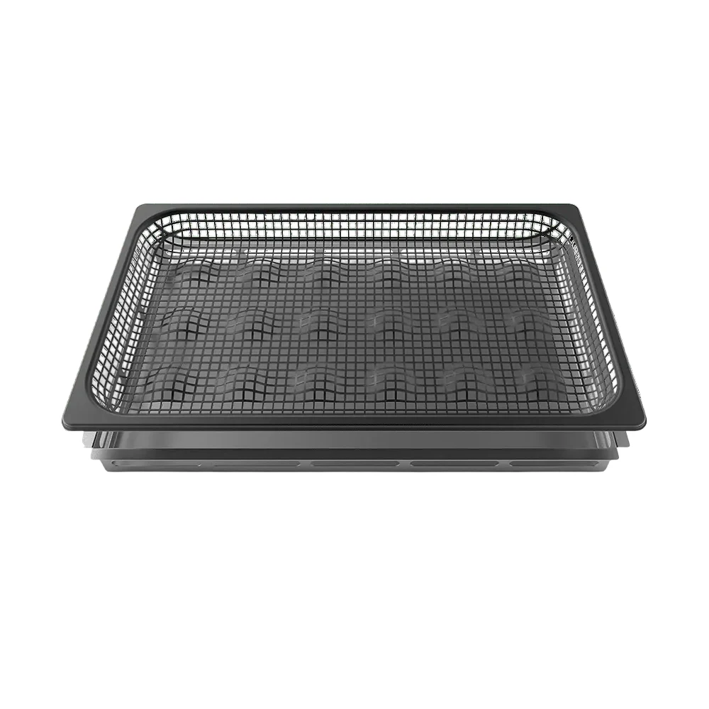 - Non-stick perforated stainless-steel frying grid with fat-collection tray.